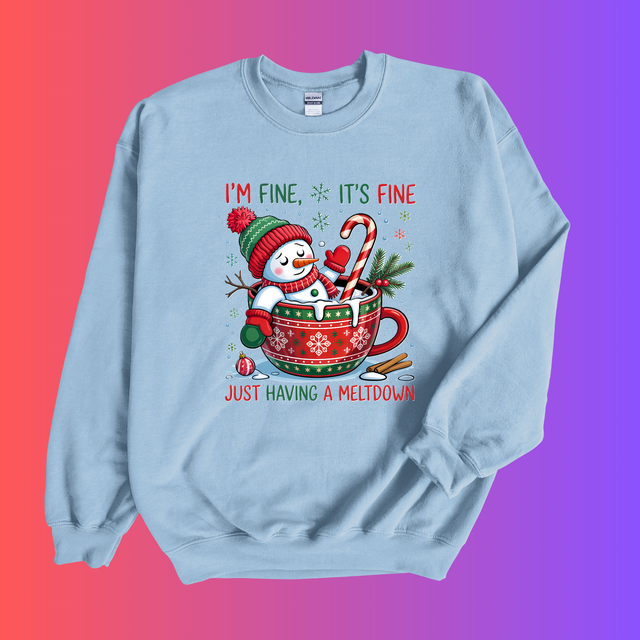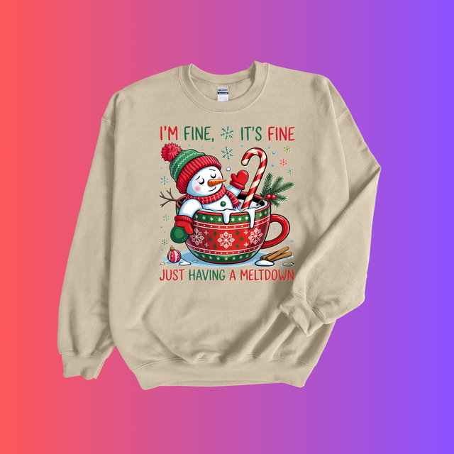 elebrate the chaos of the season with a jumper that truly understands you. The "I'm Fine, It's Fine – Meltdown Christmas Jumper" features a whimsically tragic snowman melting in a cup, perfectly capturing the holiday spirit… or lack thereof. Printed on a cozy Gildan 18000 sweatshirt, this jumper comes in three festive colours: Sand, Sky Blue, and Maroon. Whether you’re thriving or barely surviving, this is your go-to sweater for awkward family dinners, Zoom parties, or emotional breakdowns under the mistletoe.